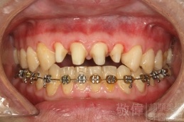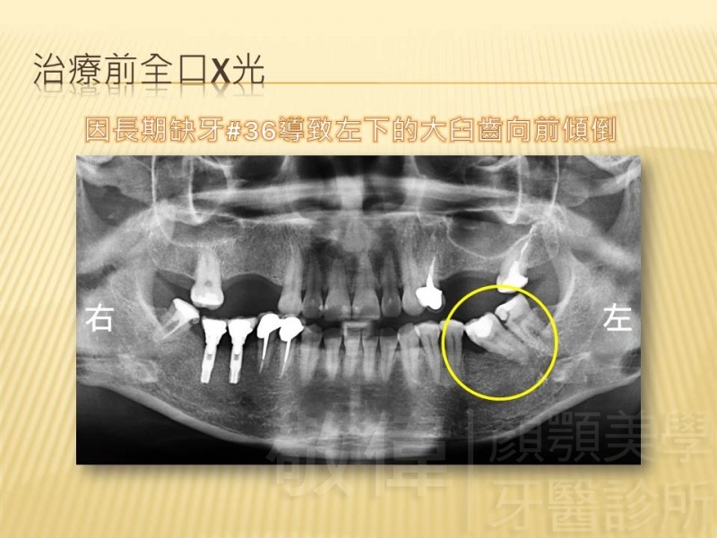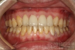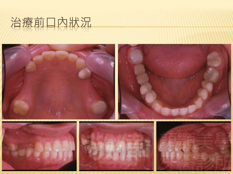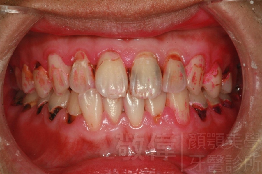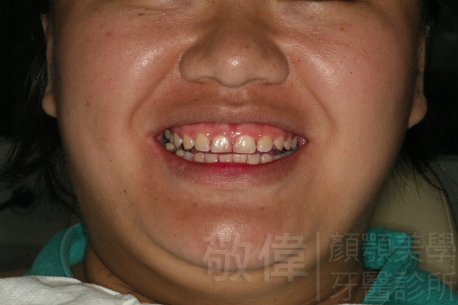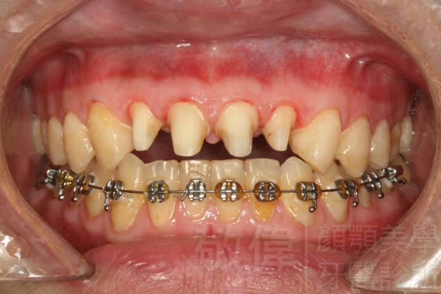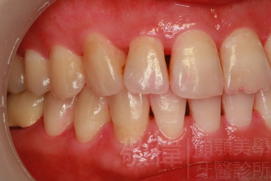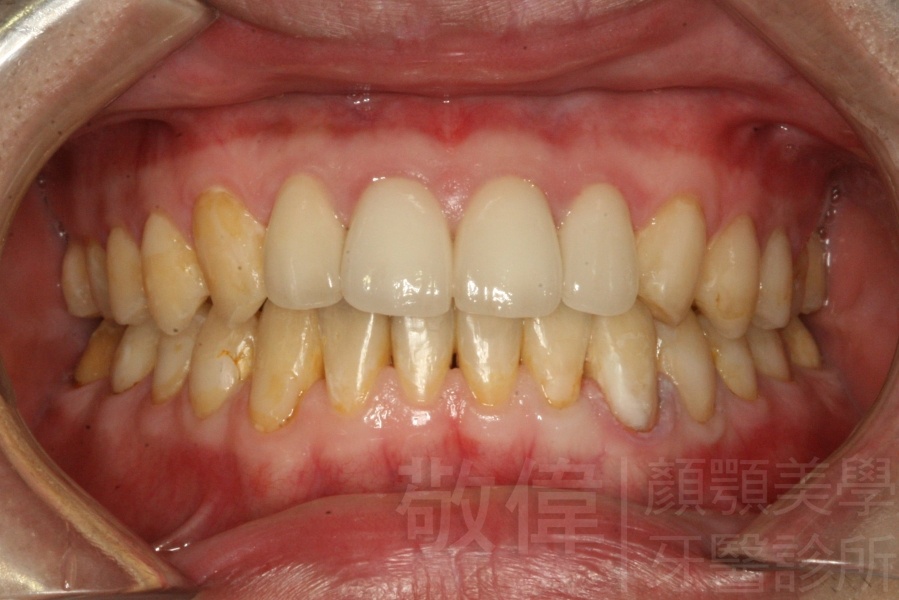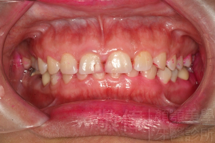 患者剛來的時候主要是為了臼齒咬列而前來就診,只是就我那麼要求顏顎美的醫師眼裏,看到他上顎前牙牙冠部分比較短,整體看起來比例很怪,真的不好看,所以建議他做牙冠增長術。當下他不知道是嚇到了還是太開心,原本以為這短短的門面要這樣跟著他一輩子了,沒想到竟然是在看牙齒的機緣下找到救星。